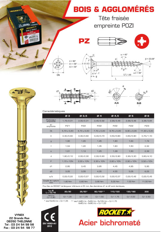 Vis tête fraisée ROCKET pozidriv acier bichromaté Ø6x90mm boite 150